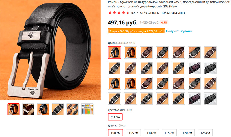 Разнообразные мужские ремни из натуральной (как там обещается) воловьей кожи с классической стальной пряжкой. Разные расцветки, разные формы пряжек, разная длина. Цена - порядка 1200 рублей за ремень (там доставка семьсот с чем-то рублей, но если искать бесплатную доставку, то цена так порядка 1200 за ремень и останется).