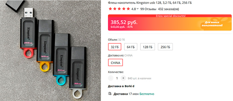 Стильные флешки Kingston в фирменном магазине Kingston: емкости от 32 до 256 ГБ. Есть кольцо для крепления к ключам в качестве брелка (и брелока тоже).