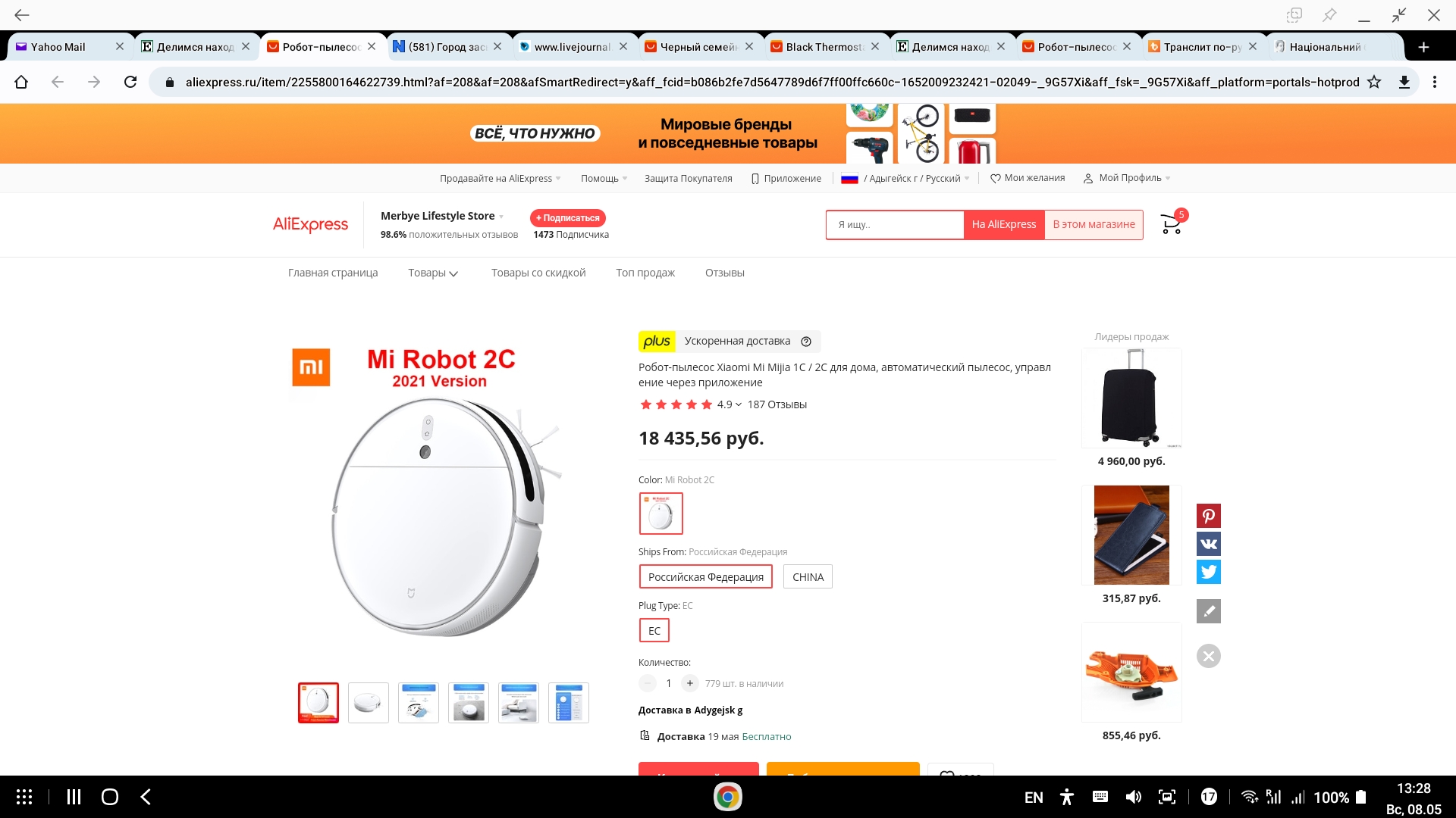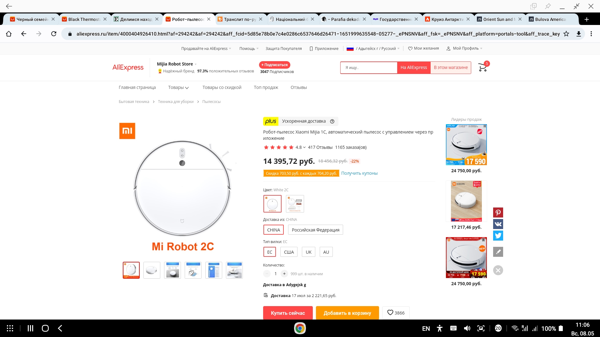 Ну и если вам хочется более продвинутый пылесос - с камерой, чтобы строил карту помещений и так далее, - тогда, конечно, можно заплатить немного больше, но взять уже классический и очень популярный робот-пылесос Xiaomi Mijia Sweeping Vacuum Cleaner 1C, цена которого с российского склада сейчас 13 500 рублей (это китайская версия, как в моем обзоре). Глобальная версия стоит сильно дороже - минимум в два, а то и в три раза. Я именно его использую где-то раза три в неделю, очень им доволен, отличный пылесос.