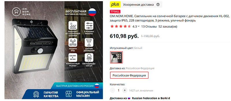 Доставка с российского склада за три дня. Из плюсов - очень хороший охват камеры, почти под 90 градусов сбоку. На дешёвых давно такого не встречал. Также, как утверждается, стоит суперконденсатор вместо батареи, что тоже совсем неплохо.