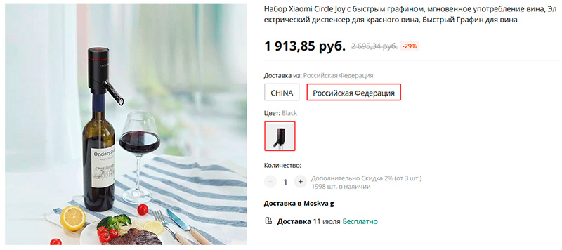Смотрите, какой крутой диспенсер-аэратор выпустила компания Xiaomi. У меня есть похожая штука, но она очень громоздкая и неудобная. А эта - компактная, и она удобнее на порядок. Электрическая, заряжается через microUSB. На верхней грани устройства - кнопка. Надеваете диспенсер на горлышко открытой бутылки, нажимаете на кнопку - вино, проходя через специальный механизм, аэрируется (насыщается кислородом) и поступает в бокал. Есть доставка с российского склада. Я себе из Китая заказал, обещают за 12 дней привезти.