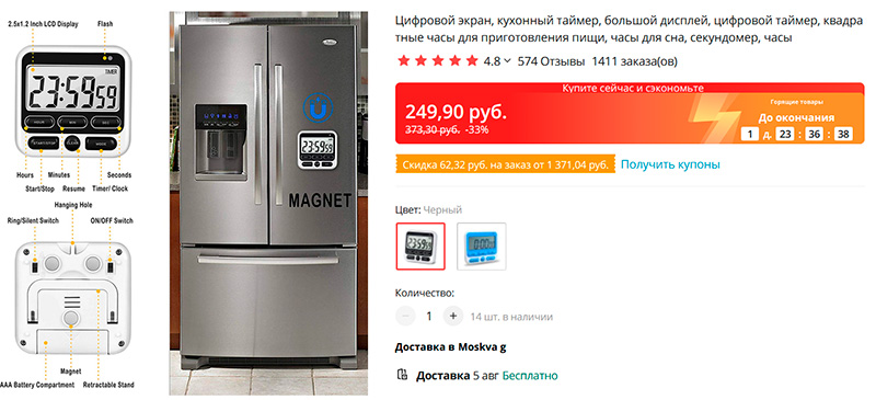 Мультифукнциональное устройство с подставкой и магнитным креплением для холодильника. Это таймер, секундомер, электронные часы и будильник. Кроме звукового сигнала может оповещать мигающим светодиодом. Два цвета, большой дисплей с хорошо читаемыми цифрами.