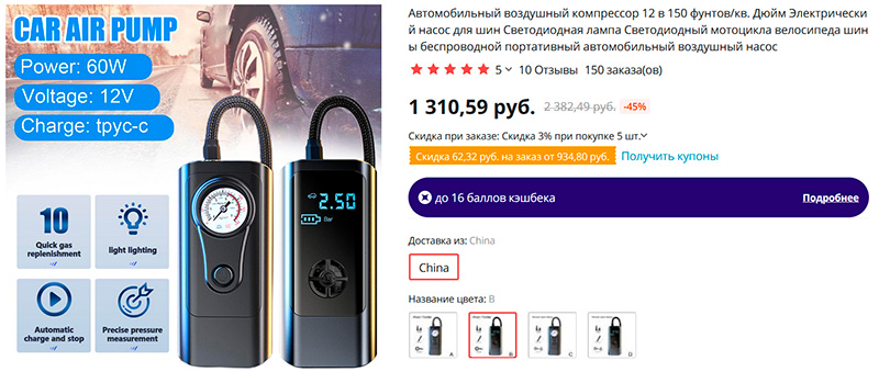 Компактный универсальный воздушный компрессор для накачивания шин различного типа, мячей, надувных матрацев и так далее. Имеет различные переходники. Двух типов - с механическим манометром или электронным. Может заряжаться от прикуривателя (есть вариант комплектации с подобным кабелем). Есть встроенный фонарик. Я использую похожий - это очень удобно.