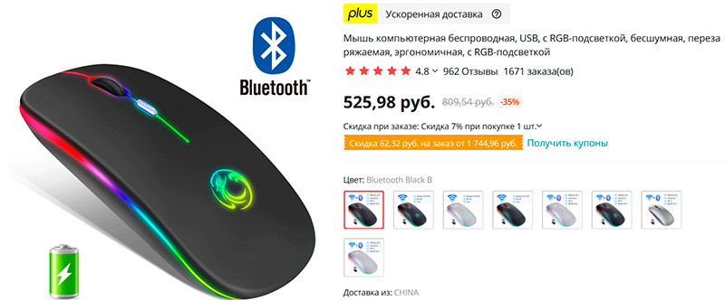 Недорогая эргономичная мышь с RGB-подсветкой. Различных цветов, может подключаться по Bluetooth или через свой адаптер, заряжается от порта microUSB, поддерживает одновременное подключение к двум устройствам, имеет три режима чувствительности: 800, 1200 и 1600 dpi. Есть версии с доставкой с российского склада.