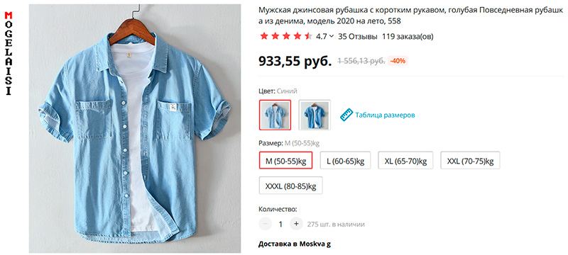 Рубашка из тонкого денима (чистый хлопок) двух расцветок и четырех размеров. Будьте внимательны - размеры азиатские, смотрите таблицу. У меня сейчас обычный размер - М, тут это XXL. Я заказал, покажу, как приедет. Мне интересно, насколько они тонкие. Я люблю рубашки из денима, а у меня те, что есть, - уже старые, да и не по размеру.