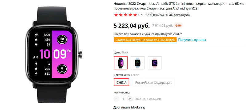 Умные часы Amazfit GTS 2 mini (это компактная версия часов Amazfit GTS 2) сейчас можно купить дешевле 5 тысяч рублей (возьмите купон на скидку). Дисплей 1,55", металлический корпус, три варианта цветов, хорошая функциональность, режим AOD, отличная автономность - с мониторингом всего чего только можно и без постоянно включенного экрана часы держатся от одного заряда 11-12 дней.