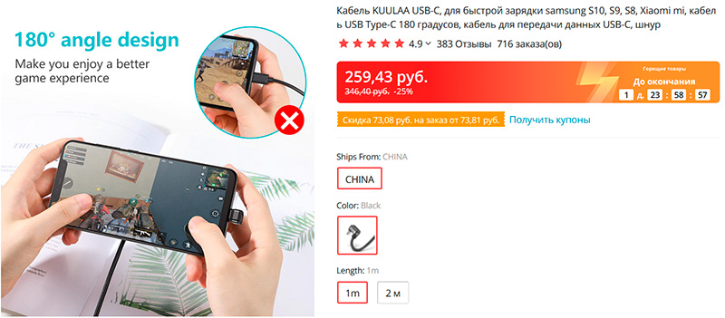 Хитрый кабель Type-C, загибающийся на 180 градусов, позволяющий без проблем пользоваться смартфоном/планшетом во время зарядки. Два размера - один и два метра.