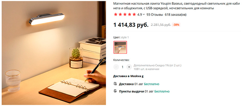 Магнитная лампа Baseus. Основание на липучке, крепится к вертикальной или горизонтальной поверхности, лампа на основании может поворачиваться. Имеет аккумулятор, может работать до 24 часов на невысокой яркости, до 4 часов на максимальной. Температура цвета регулируется, может также работать ночником на минимальной яркости.