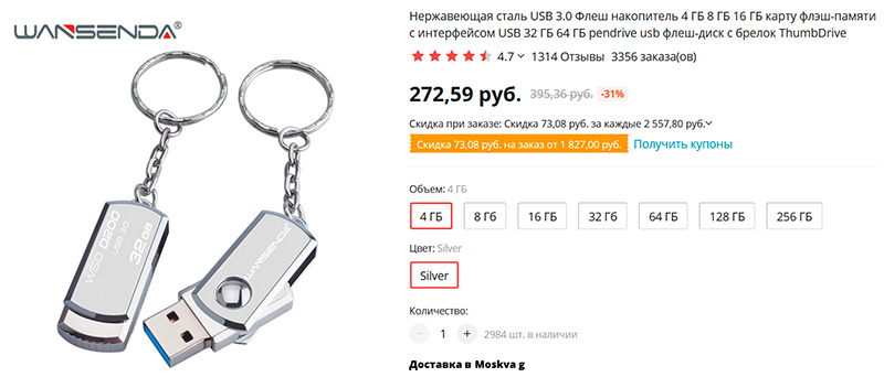 Металлическая флешка-брелок из нержавейки емкостью от 4 до 256 ГБ. Я именно такую и использую - на ней записаны всякие важные данные и сканы документов.