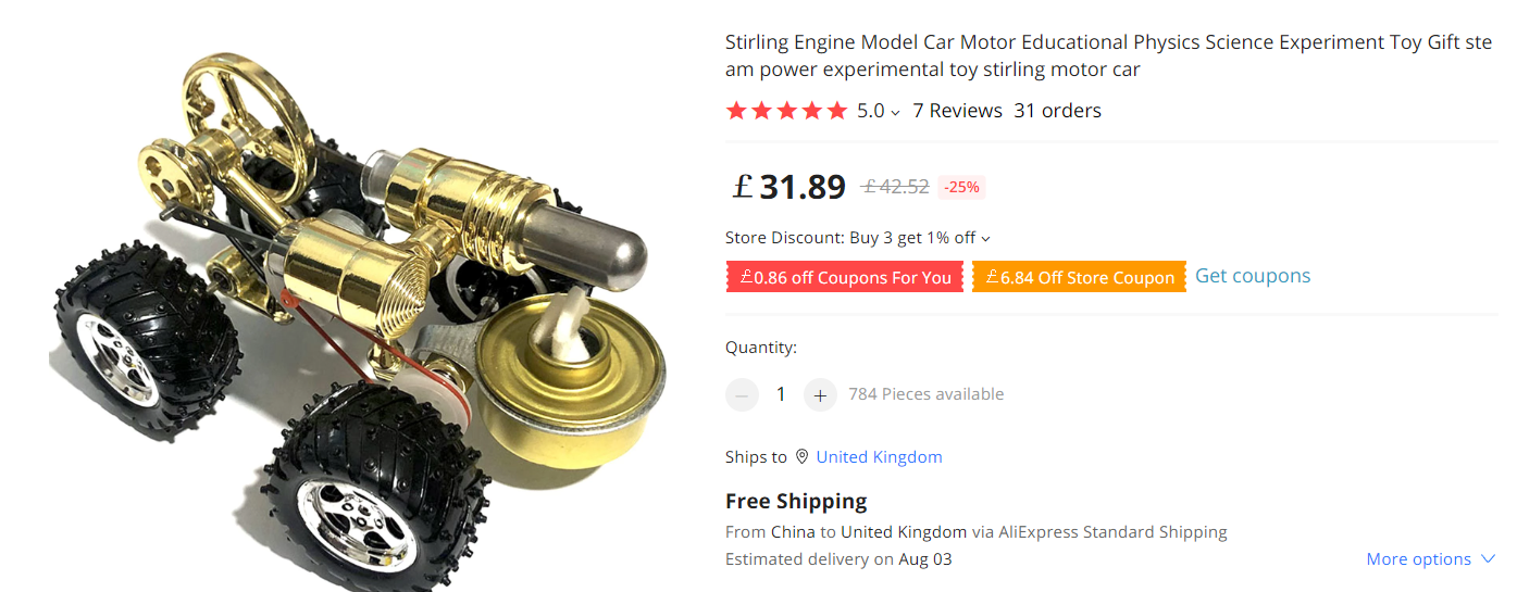 машинка, которая ездит на спиртовке (двигатель стерлинга). Врать не буду, по видео видно, что ездит довольно херово.