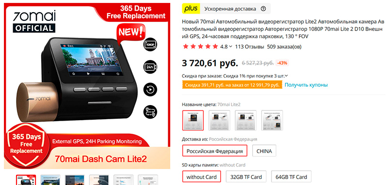 Если нужна модель попроще и дешевле, то у них недавно вышла 70mai Dash Cam Lite 2. Ничего лишнего, разрешение FullHD. Доставка с российского склада.