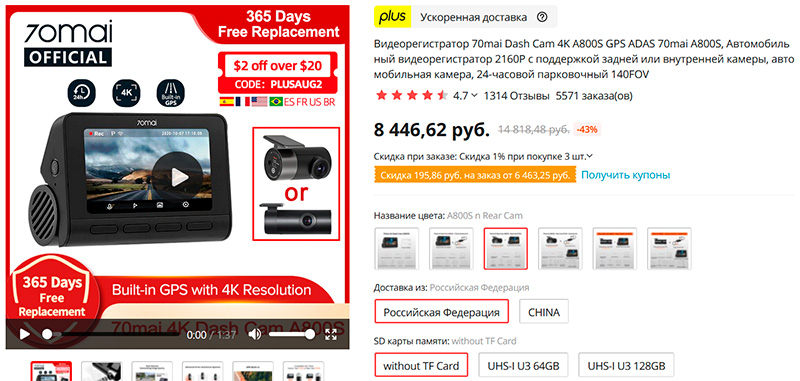 Удобный и качественный видеорегистратор 70mai A8000S с задней (или внутренней) камерой с доставкой с российского склада. Видеорегистратор очень хороший, я делал его обзор. Видео 4К, режим парковки, ADAS, встроенный GPS и все такое.