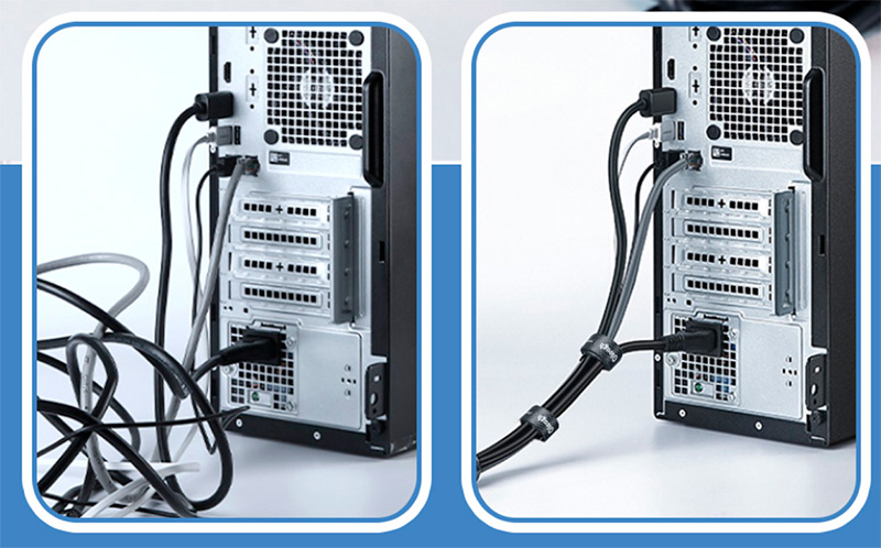 Я закупил стяжки разных типов и перестал вообще напрягаться. Стяжки, в отличие от липучек, можно затянуть или оставить свободными - кольцо всё равно не порвётся, кабели не выпадут. Они намного удобнее.