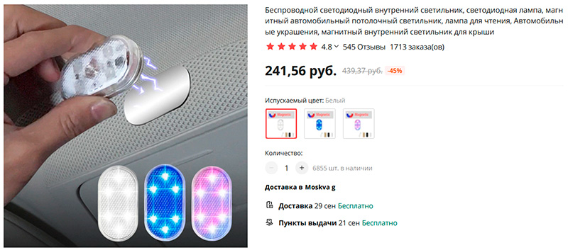 Компактные светодиодные светильники различных цветов. Имеют магнитное крепление, посадочная площадка крепится на липучке. Одной зарядки через порт MicroUSB хватает на 2,5 часа работы. Включаются нажатием. Размещаются в ящиках, шкафах, в автомобиле - везде, где требуется дополнительная подсветка.