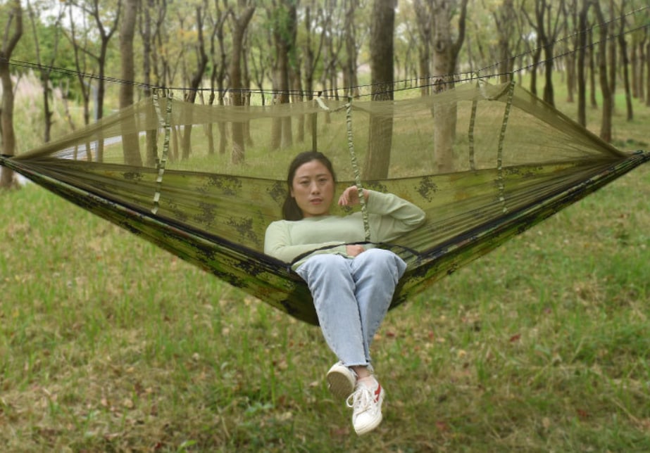 Гамак. Его можно растянуть между деревьями на даче или на отдыхе. Крепится карабинами к завязкам, сделан из нейлона и прошит тремя строчками - такая конструкция выдерживает до 200 кг. Сверху можно закрыться антимоскитной сеткой.
