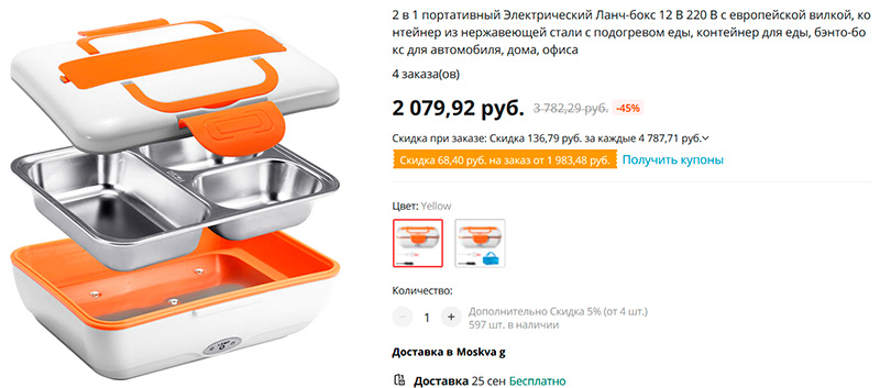 Иметь домашний горячий обед в офисе (предварительно, конечно, приготовленный) - ланчбокс с разогревом, снабженный ручками для переноски. Стальная емкость на три отсека, съемные стальные ложка и вилка, адаптеры для подключения к розетке и прикуривателю машины. Защита от подгорания еды, для разогрева требуется 20 минут. Есть вариант комплектации с термопакетом-переноской.