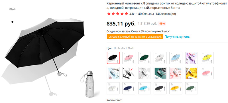 Сверхпортативные, фактически - карманные зонты различных цветов. Длина в сложенном состоянии - 19 см. В разложенном - диаметр зонта 95 см, высота с ручкой - 56 см.