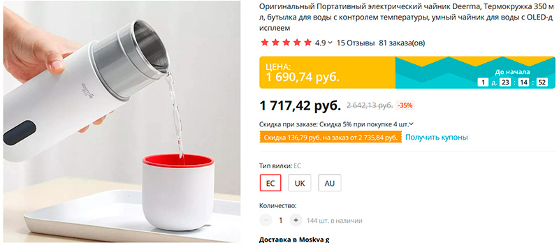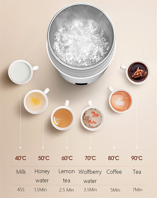 Стальной термос Deerma на 350 мл с дисплеем и функциями подогрева (от розетки). Крышка термоса одновременно является чашкой. Термос может вскипятить воду, также может поддерживать температуру напитка от 40 до 90 градусов.