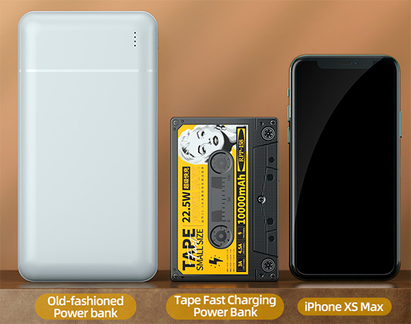 "Внешний аккумулятор на 10000 мАч с дисплеем, поддержкой быстрой зарядки на 18 ватт и с мощностью на выходе до 22,5 ватт - в формате аудиокассеты. "