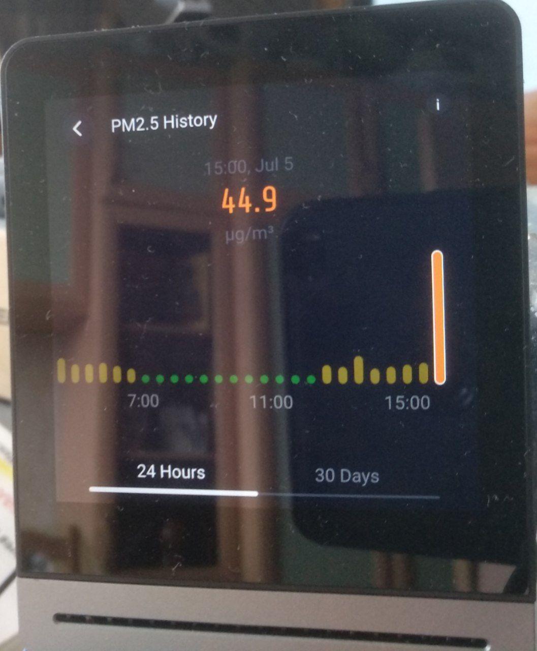 Что показывает? Время, погоду, температуру, влажность, индекс PM 2.5 (загрязненность воздуха частицами), уровень углекислого газа и концентрацию летучих органических соединений. Экран сенсорный, есть несколько вариантов виджетов дисплея, показывает графики изменения параметров содержимого воздуха.