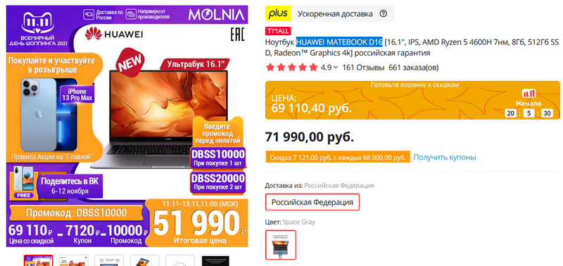 Пришло время покупки хорошего ультрабука с большим экраном? Вот хороший вариант с российского склада и с российской гарантией: Huawei MateBook D16. Памяти 8/512 ГБ SSD, платформа AMD Ryzen 5 4600. С купоном и промокодом обещают цену в 52 тысячи. Я пробил по "Яндекс.Маркету" - на него цены от 68 до 78 тысяч. Хорошая скидка получается, я бы по такой цене и сам купил, если бы мне его в Испанию выслали. У меня жена где-то год работает на Huawei MateBook D14 - очень хорошая машинка.