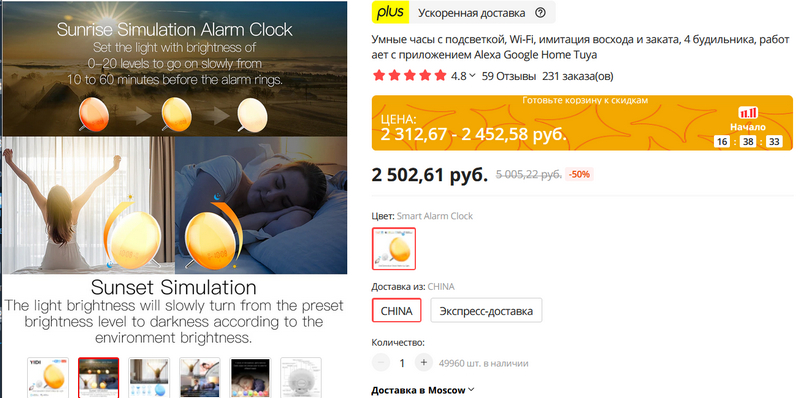Часы с будильником, умеющие имитировать закат и рассвет (цвета меняются, также цвет можно вообще отключить). Есть Wi-Fi для удаленного управления голосом, четыре режима работы. В будильник загружены мелодии, имитирующие пение птиц, шум волн, деревьев в лесу и так далее. Хорошая штука, я сыну именно такие часы купил - третий год уже пользуется.