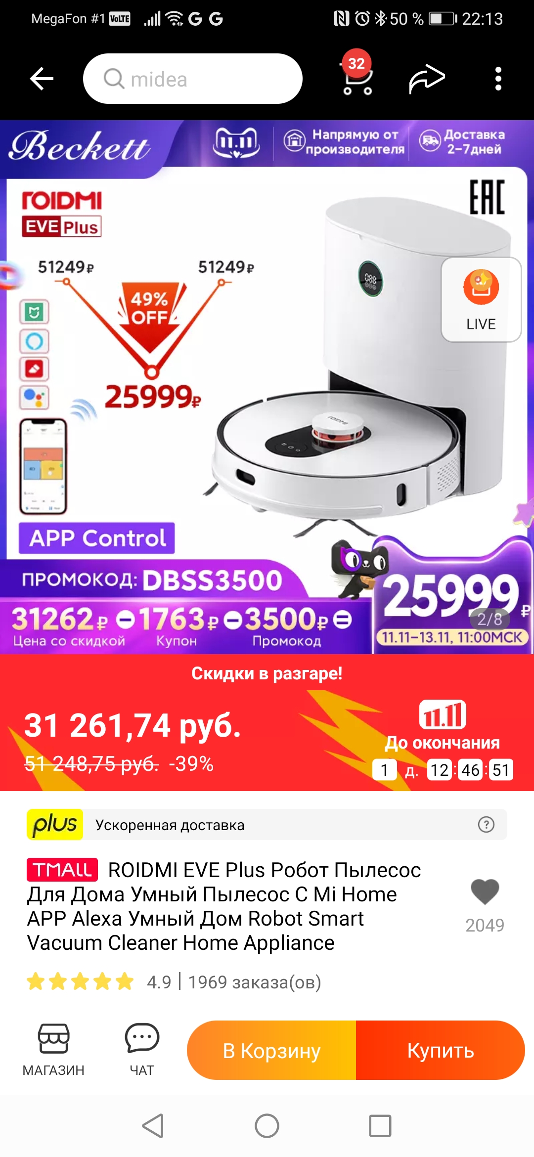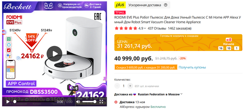 Обещают хорошую скидку на очень крутой робот-пылесос ROIDMI EVE Plus: лидар 4-го поколения, карта помещения, уборка по расписанию, уборка сухая и влажная, управление со смартфона, в зарядной станции установлена специальная трехлитровая емкость для мусора, куда автоматически опорожняется контейнер робота, - в общем, круть. Никакие 40 тысяч он, конечно, не стоит, но на "Яндекс.Маркете" цена на него - 31 тысяча, так что если на распродаже с купоном и промокодом действительно уронят цену до 24 тысяч, то это будет очень хороший вариант, возьмите на заметку. Я бы его за такие деньги купил не задумываясь, но это доставка с российского склада. А у нас в "Амазоне" этот робот-пылесос, если переводить в рубли, стоит именно 41 тысячу.