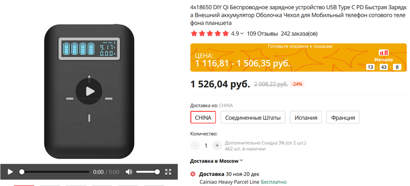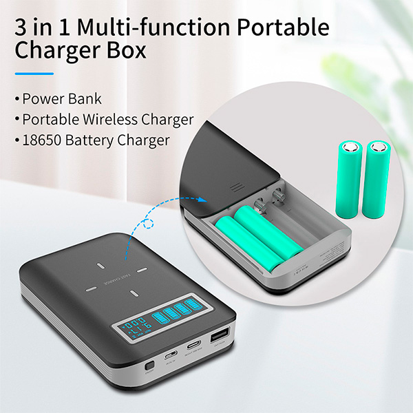 Любопытная штука - внешний аккумулятор "3 в 1". Точнее, емкость под внешний аккумулятор. Устройство рассчитано на установку четырех перезаряжаемых аккумуляторов 18650. Какую емкость используете, такая общая емкость у аккумулятора и будет. Мощность - PD 18 ватт. Есть дисплей, поддерживает беспроводную зарядку. Заодно еще это и зарядник для аккумуляторов (ток подается через microUSB).