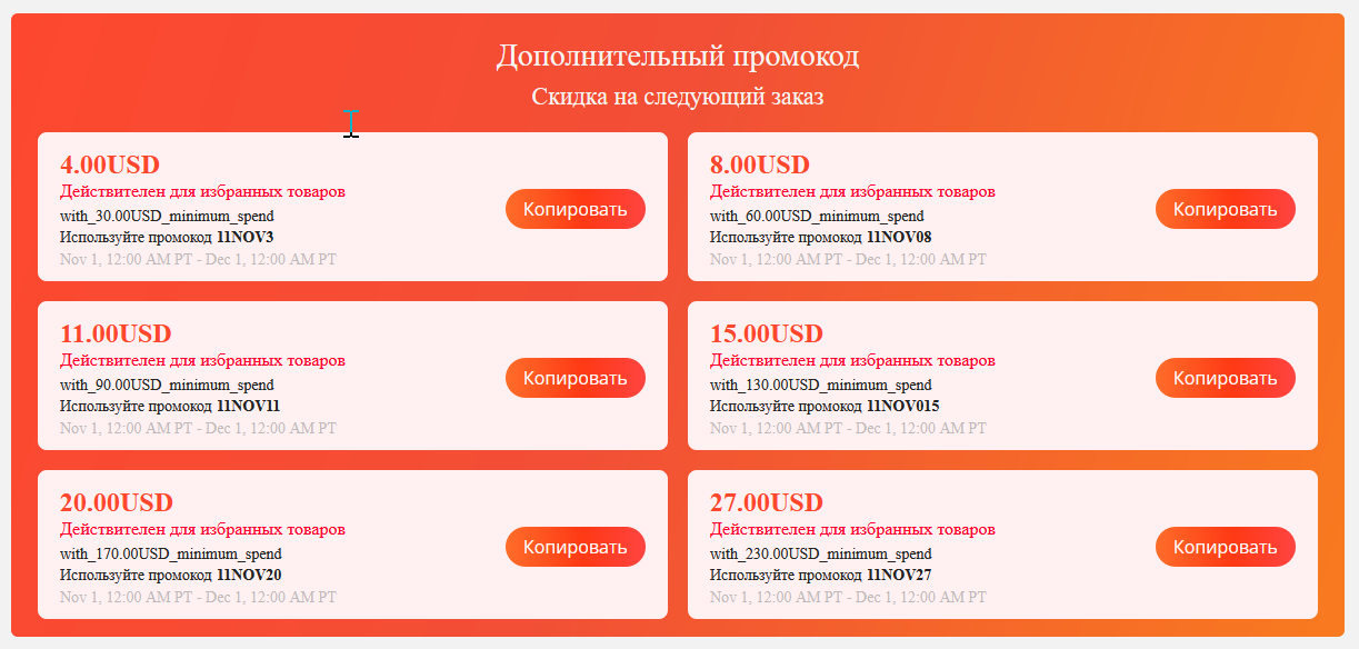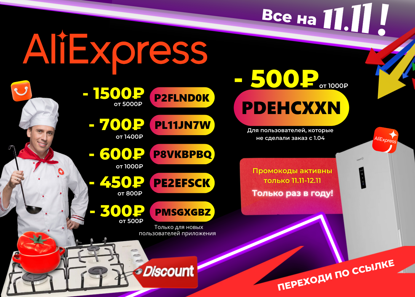Все промокоды действуют в период с 11 по 13 ноября, распространяются на заказы в страны СНГ. Количество активаций ограниченно.