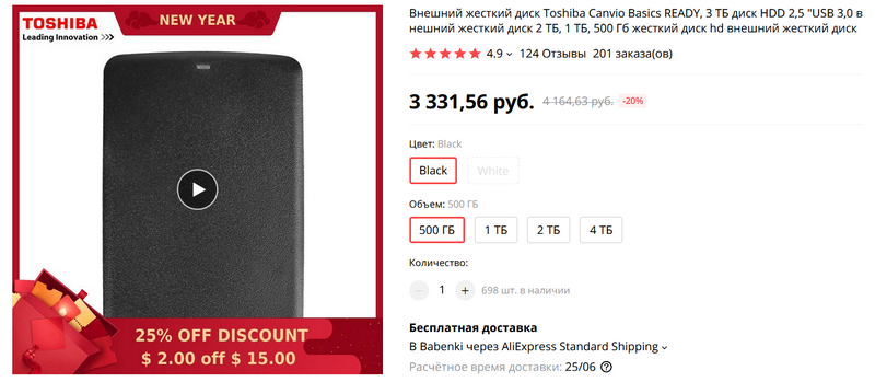 Внешний жесткий диск от Toshiba различных емкостей. Надежный производитель, хорошие отзывы.