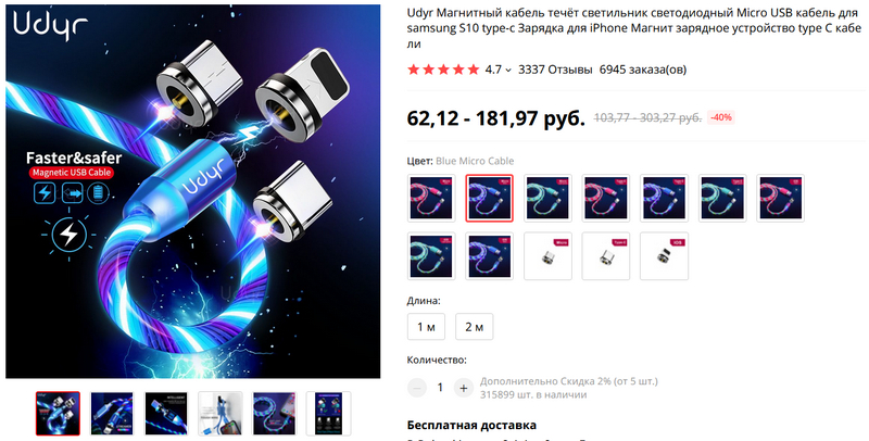 Кабели с магнитной головкой популярны среди многих пользователей: удобно подключать к зарядке и полностью убирается риск со временем раздолбать порт. Вот еще один вариант такого кабеля - светящегося при зарядке. Есть разные головки, разные цвета свечения, есть однометровые и двухметровые.