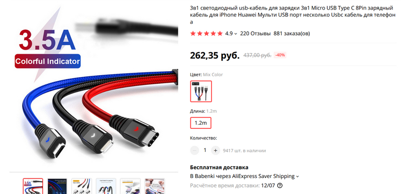Еще полезный кабель "Три в одном" (он только для зарядки, подчеркиваю). Все три головки - microUSB, Type-C и Lightning на одном кабеле длиной 1,2 метра. Очень удобно то, что под каждую головку - свой цвет, я давно такие использую.