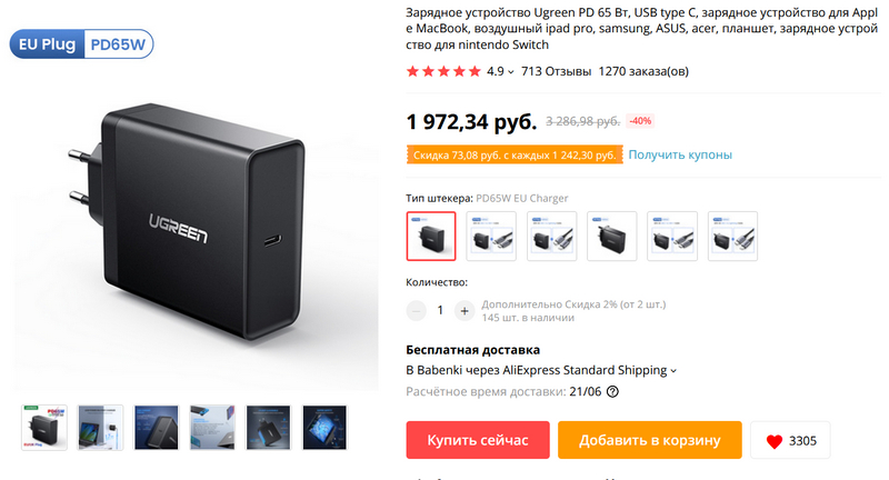 Адаптер Ugreen с Power Delivery на 65 Ватт - для современных ноутбуков, ну и других устройств, включая планшеты и смартфоны.