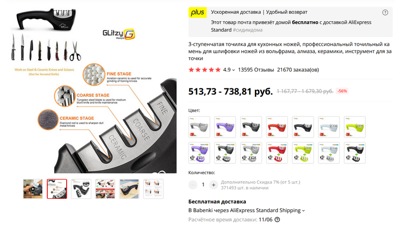 Удобная 3-ступенчатая точилка для ножей. Есть разных цветов.