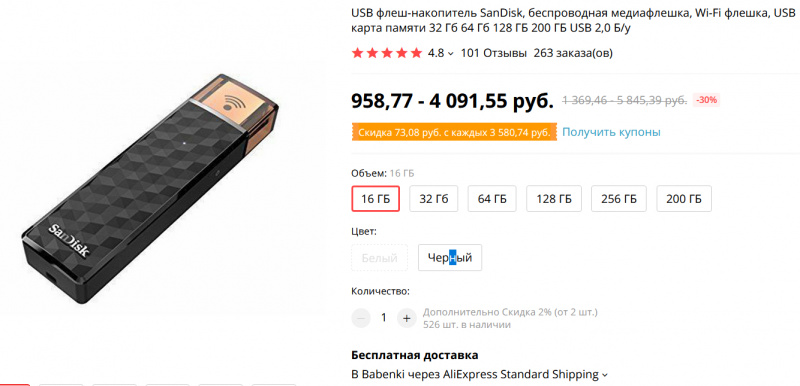 Интересная штука: флешка SanDisk любого размера от 16 до 256 ГБ. Главная особенность - флешка снабжена модулем Wi-Fi, что позволяет ее использовать как мини-облако для, например, смартфона. Накачали на флешку медиаконтента, подключились к ней со смартфона - слушаете или смотрите. И у смартфона память не занята.