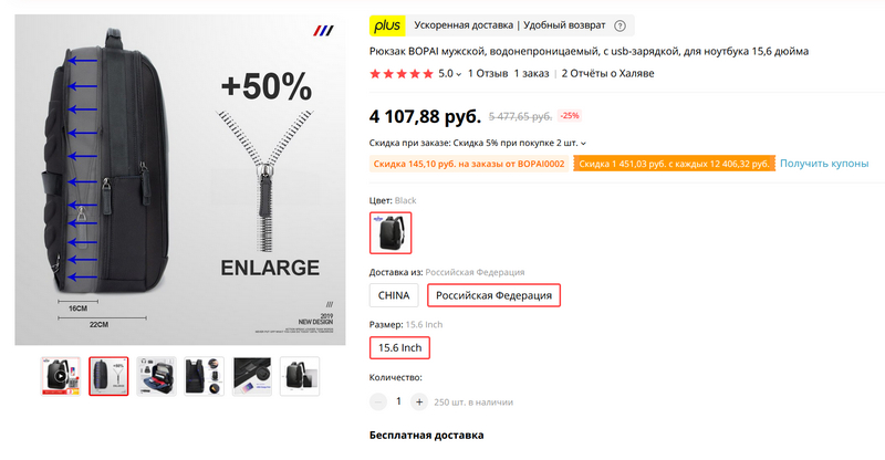 Еще один рюкзак того же производителя - водонепроницаемый, с портом для зарядки, в котором можно увеличивать емкость на 50%. Тоже есть доставка с российского склада.