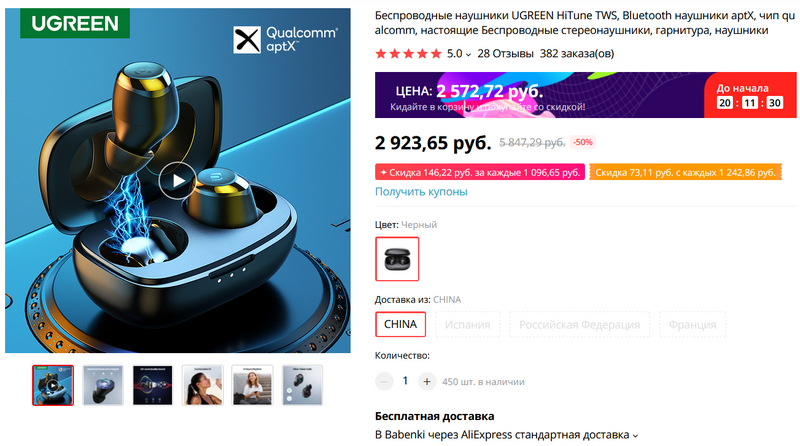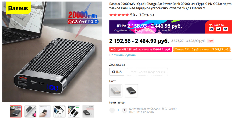 Цену можно снизить промокодом BASEUS20000 (365,55 руб) и купоном магазина 1$