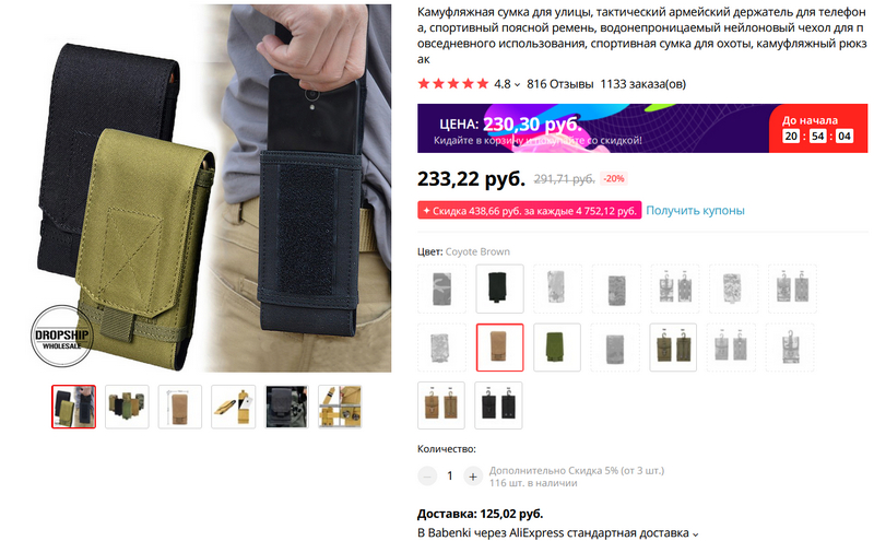 Ну и в тему к ремню - наременный чехол для смартфона различных цветов. Доставка 125 рублей, так что цена получается 358 рублей.