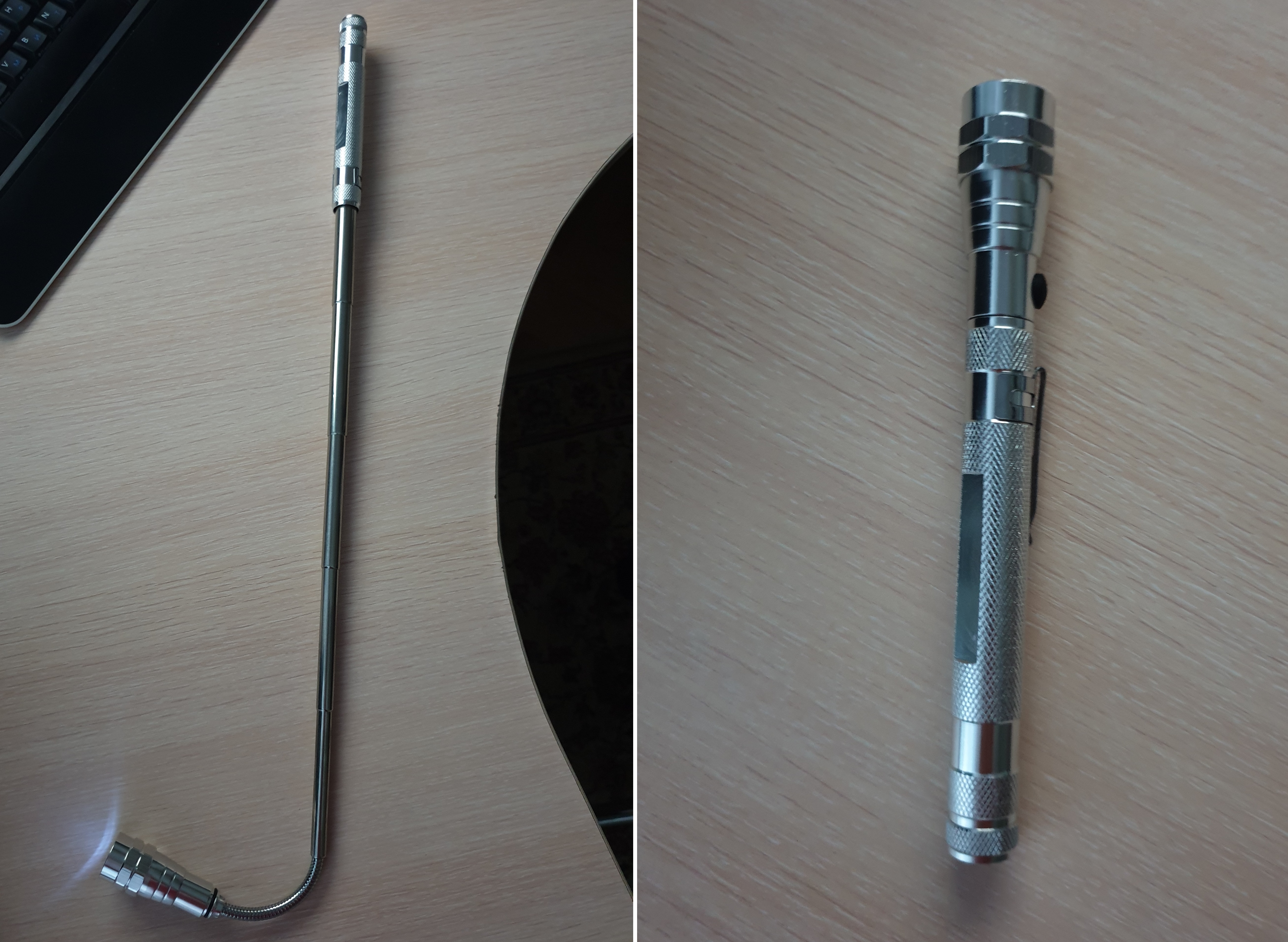 Полезная в хозяйстве вещь - телескопическая палка (19-65 см) с сильным магнитом на конце и фонариком: доставать всякие закатившиеся металлические предметы. Я ее как увидел - сразу же заказал: несколько раз очень жалел, что у меня нет такой штуки.