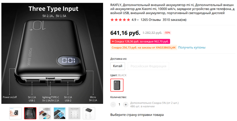 Недорогой и очень компактный внешний аккумулятор RAXFLY на 10000 мАч с цифровым дисплеем.