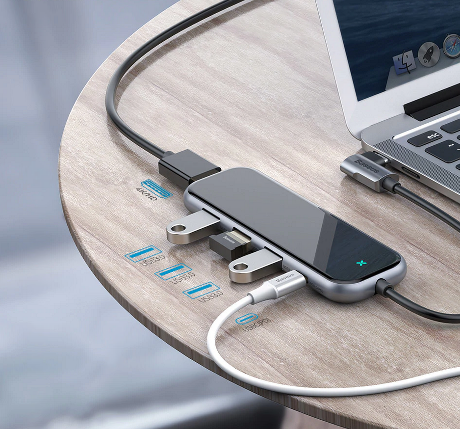 Девайс оснащён беспроводной зарядкой, портами USB 3.0, Type‑C и PD, выходом HDMI, аудио‑разъёмом 3,5 мм, RJ45. Доступны разные комбинации.