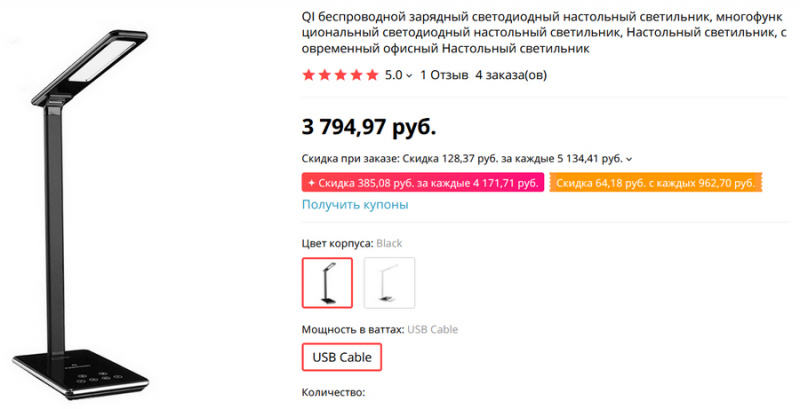 А вот это я себе заказал: как раз искал настольную лампу на светодиодах с регулировкой не только уровня освещения, но и цветовой температуры. Сенсорное управление, еще и беспроводная зарядка до кучи.