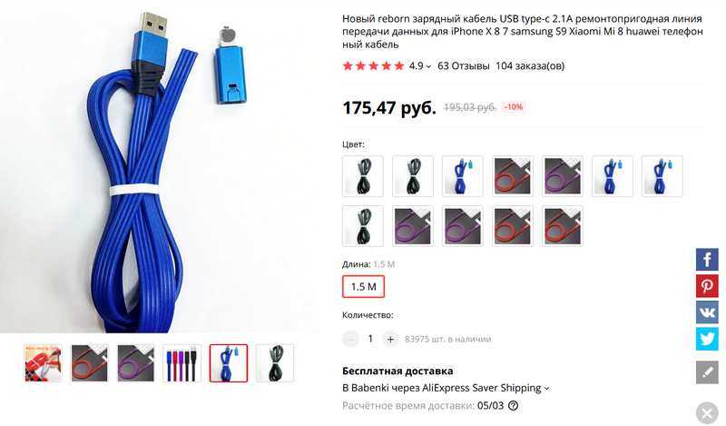 Полутораметровый ремонтопригодный зарядный кабель различных расцветок и с различными головками. Актуально для тех, у кого кабели часто перекручиваются и ломаются. Здесь если кабель поломался, головка-штекер снимается, поврежденный кусок отрезается, головка снова сажается на укороченный кабель. Полтора метра хватит надолго.