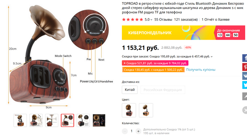 Прикольная беспроводная колонка в ретро-стиле. Подключается по BT, по проводу, имеет FM-радио, может воспроизводить с карты памяти. Мощность динамика - 5 Ватт.