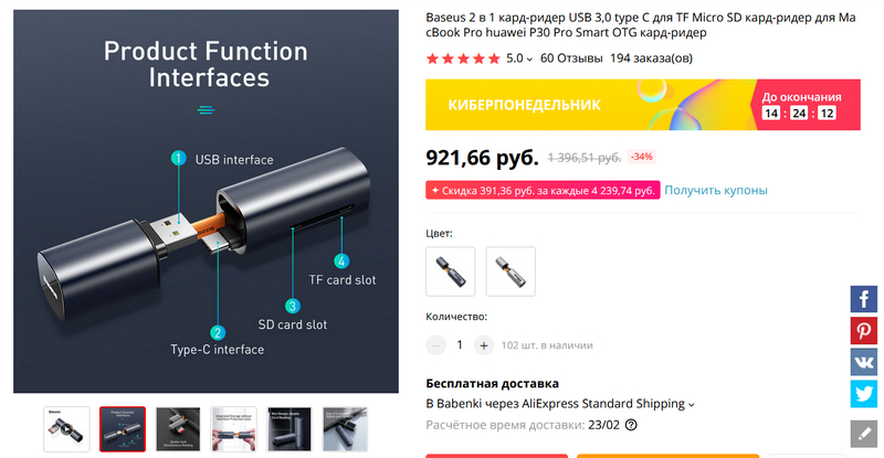 Сверхкомпактный кардридер от Baseus два в одном: работает и от обычного USB-A  и через Type-C (то есть для смартфонов/планшетов с OTG становится накопителем). Размером с тюбик помады. Закажу для поездок, пусть в дорожном рюкзаке лежит.