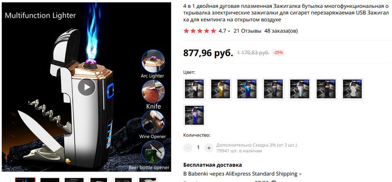 Еще одна зажигалка - дуговая-плазменная. Подороже, но четыре в одном: зажигалка, ножик, штопор, открывалка. Полный набор уверенного в себе мужчины.