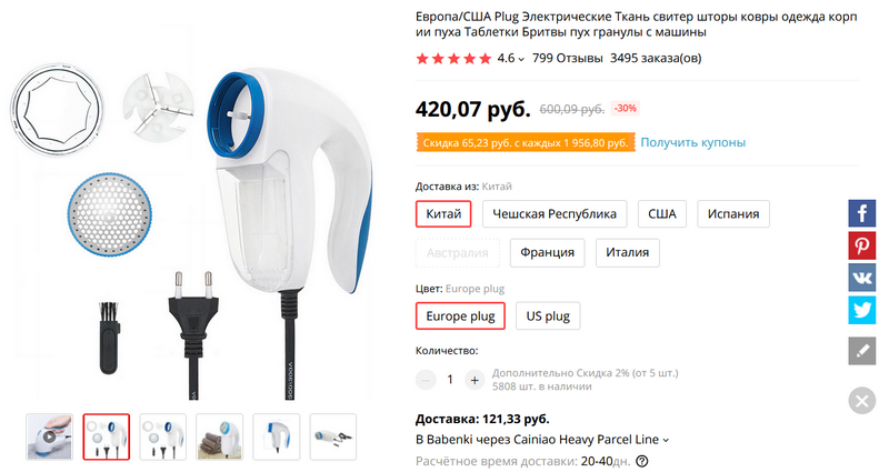 Это я себе искал - устройство для срезания катышков с одежды. Я люблю легкие флисовые кофтенки, а у них воротник довольно быстро покрывается катышками и теряет приличный вид, хотя сами кофты при этом в полном порядке. Пробовал брить воротник бритвой-станком - да, снимает катышки, но занятие довольно геморройное. Тут обещают, что все будет легко и просто. Заказал, посмотрим. Обратите внимание - для России будет платная доставка 121 рубль.