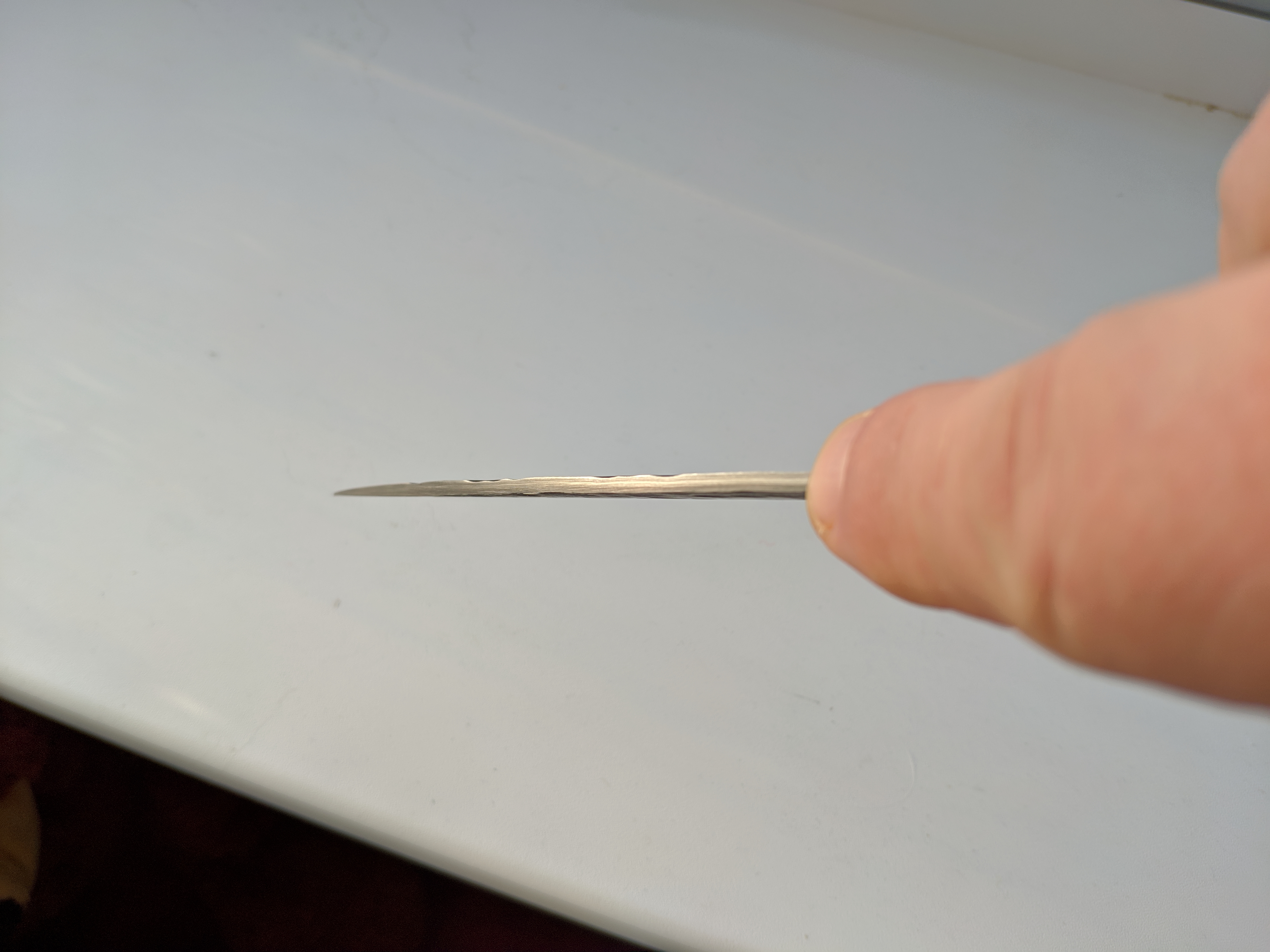 У меня есть один честно кованный кукри с похожим финишем верха (острый до жути, за один хороший замах - полкуста сирени сносит), но там карбоновая сталь и все понятно, что откуда.