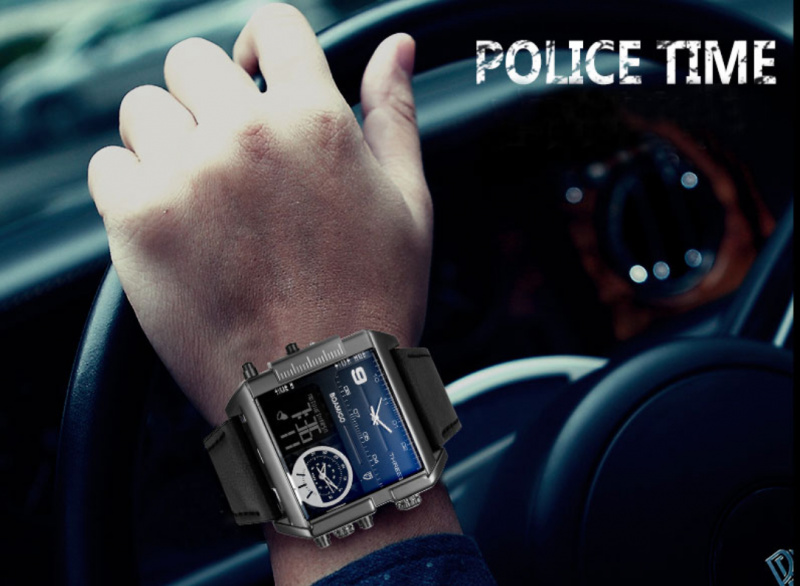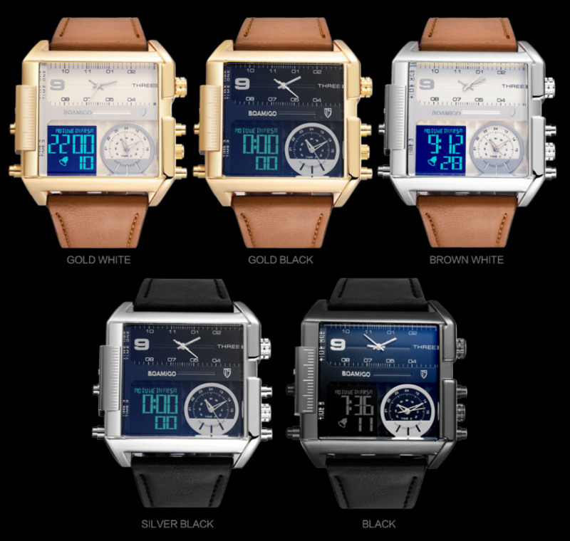 Любопытные мужские часы. Кварцевые, с кожаным ремешком, с тремя часовыми поясами и цифровым дисплеем. Есть поставка с российского склада, но только черный вариант. Из Китая - различные цветовые варианты и различные ремешки.