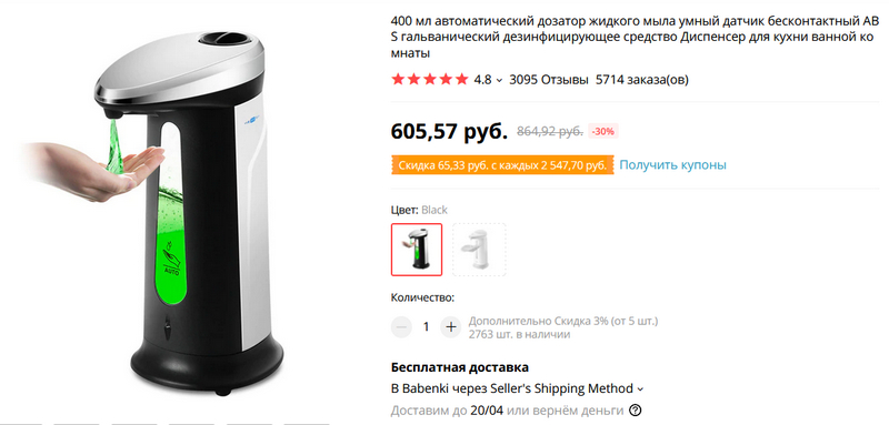 Заказал новый вариант диспенсера для мыла (у моего одноразовый контейнер я раз на двадцатый все-таки доломал). Тут просто откручивается сверху крышка и внутрь заливается моющее средство.